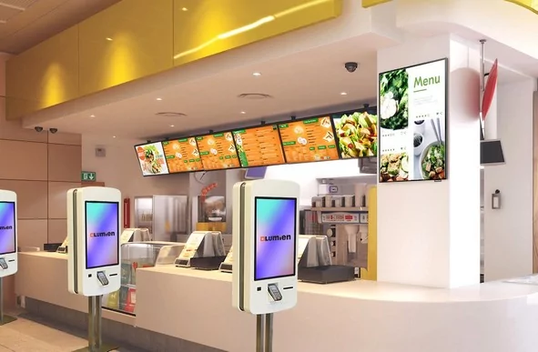 В кафе самообслуживания QSR (QUICK-SERVICE RESTAURANT) можно дополнить стойку продавца меню-бордами с описанием блюд и их ценами на дисплеях. Чтобы инсталляция смотрелась стильно и аккуратно лучше использовать профессиональные дисплеи и специальные мультидисплейные крепления, они подбираются в соответствии с размером панелей, их количеством, ориентацией в пространстве при подвесе.