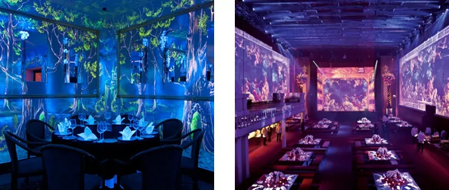Часто прием тотальной проекции используют заведения, предлагающие гостям театральные иммерсивные ужины или иммерсивные гастроспектакли. Сочетание высокой кухни с тщательным приготовлением и изысканной презентацией блюд, с погружением в современное искусство и визуальный сторителлинг становятся фирменным стилем ресторана. Визуальный ряд тотальной проекции и мэппинга может учитывать специфику меню или спектакля – французская, средиземноморская, японская кухня. Или создавать проекционные декорации к театральному действу. Важно обеспечить сменяемость контента, чередование разных спектаклей как в театре. Это обеспечит желание посетителей прийти на новый гастроспектакль. При этом поменять можно только визуальный ряд, а установленное оборудование будет использоваться в любых сценариях.