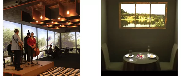 В небольших кафе и ресторанах, не имеющих естественных окон, можно заменить их проекционными. Проекционные окна создают уютный интерьер и приятную атмосферу для посетителей. «Вид из окна» может быть построен как на видео с легкой анимацией, так и на статической картинке, его можно менять в зависимости от сезона. Если территория около кафе оформлена ландшафтными дизайнерами или открывается вид на интересную перспективу улицы, возможен вариант трансляции видео с камеры размещенной на наружной стене. Посетителям можно предложить самим выбрать вид из проекционного окна или окружающий их дизайн внутри помещения.
