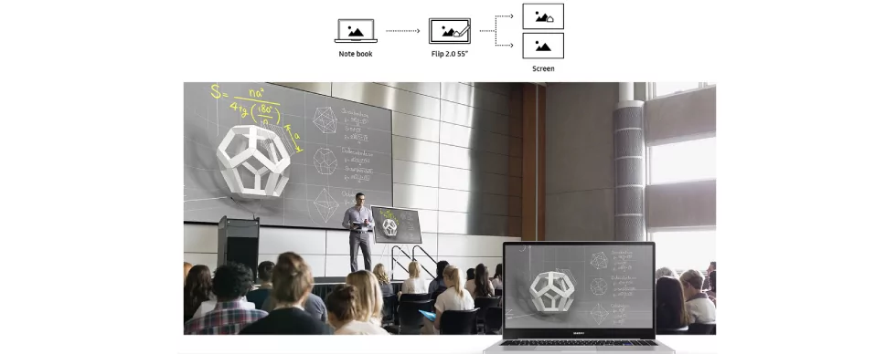 Пользователи могут спроецировать контент флип-чарта Samsung Flip на другой - больший экран в реальном времени с помощью сети Wi-Fi или подключения через HDMI порт. Экран флип-чарта можно отобразить на другом персональном устройстве. Эта функция - отличное решения для совещаний с большим числом участников. После любого совещания пользователи могут разослать резюме всем участникам и коллегам, устранив при этом традиционные проблемы, связанные с распространением рукописных материалов. Записи важных обсуждений и контент, сохраняемый в памяти флип-чарта в реальном времени, может легко пересылаться по каналам мобильной и цифровой связи.