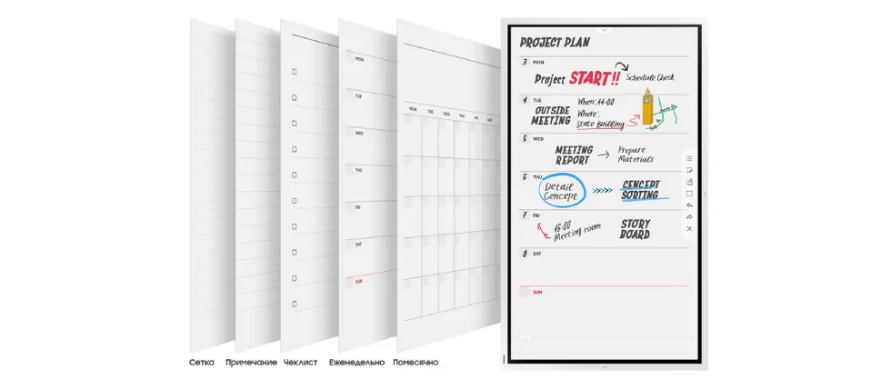 Samsung Flip поможет быть совместим с разными приложениями благодаря наличию встроенных универсальных шаблонов. Вы можете использовать флип-чарт как календарь, расписание, блокнот для заметок или как планшет со списком дел. Samsung Flip идеально подойдет для любого бизнес-проекта, предоставляя возможность использовать экран в самых разных целях.