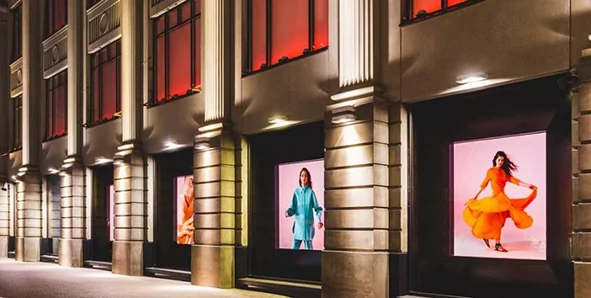 Рекламный контент может воспроизводиться на всепогодных дисплеях, расположенных на улице, LED-экранах на фасаде, а также на дисплеях в витринах магазинов и ресторанов. Как это было сделано в крупнейшем универмаге Европы ЦУМ в Москве. Компания AUVIX разработала и интегрировала систему Digital Signage в витрины ЦУМа, расположенные в пешеходной зоне улицы Кузнецкий мост, перед главным входом в универмаг. В 12 витрин были вмонтированы светодиодные экраны, на которых демонстрируется собственный видеоконтент универмага, фрагменты модных показов и рекламные ролики брендов. Технология Smart Digital Signage Technology, позволяет создавать единый сценарий для всех витрин с покадровой синхронизацией: таким образом, информационный и развлекательный контент плавно переходит с одной витрины на другую, создавая единую композицию.