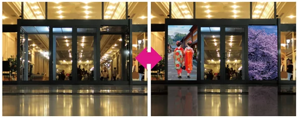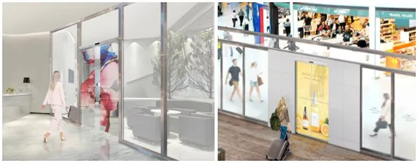 Автоматическая сдвижная дверь с прозрачными OLED-панелями открывает новые возможности для приветствия посетителей и клиентов, информирования сотрудников и трансляции рекламных сообщений.