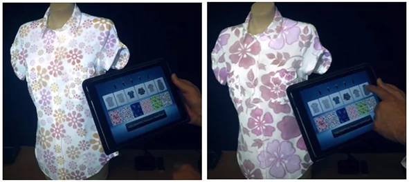 Создать динамичную рекламу на статичных манекенах можно с помощью видеомэппинга - проекции, которая скорректирует изображение под форму одежды. Таким образом можно показать варианты дизайна изделий, цветовых решений, фасонов. Это могут быть платья, рубашки, кроссовки, часы, машины и даже торты. Смена дизайна и вариантов оформления может происходить в циклическом режиме, а также можно организовать интерактивный выбор через встроенный планшет.