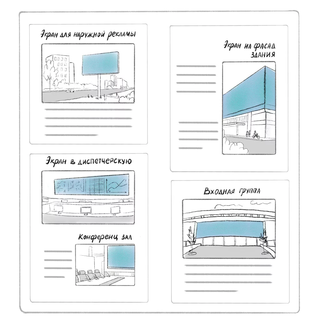 Для чего используется экран: для наружной рекламы, диспетчерской, конференц зала, шоу, концерта, мероприятия, для торгового центра, для витрины, переговорной, входной группы, производства, магазина, ресторана, фастфуда, автобуса и такси, транспортного узла, выставочного центра, музея, школы, театра, кинотеатра.