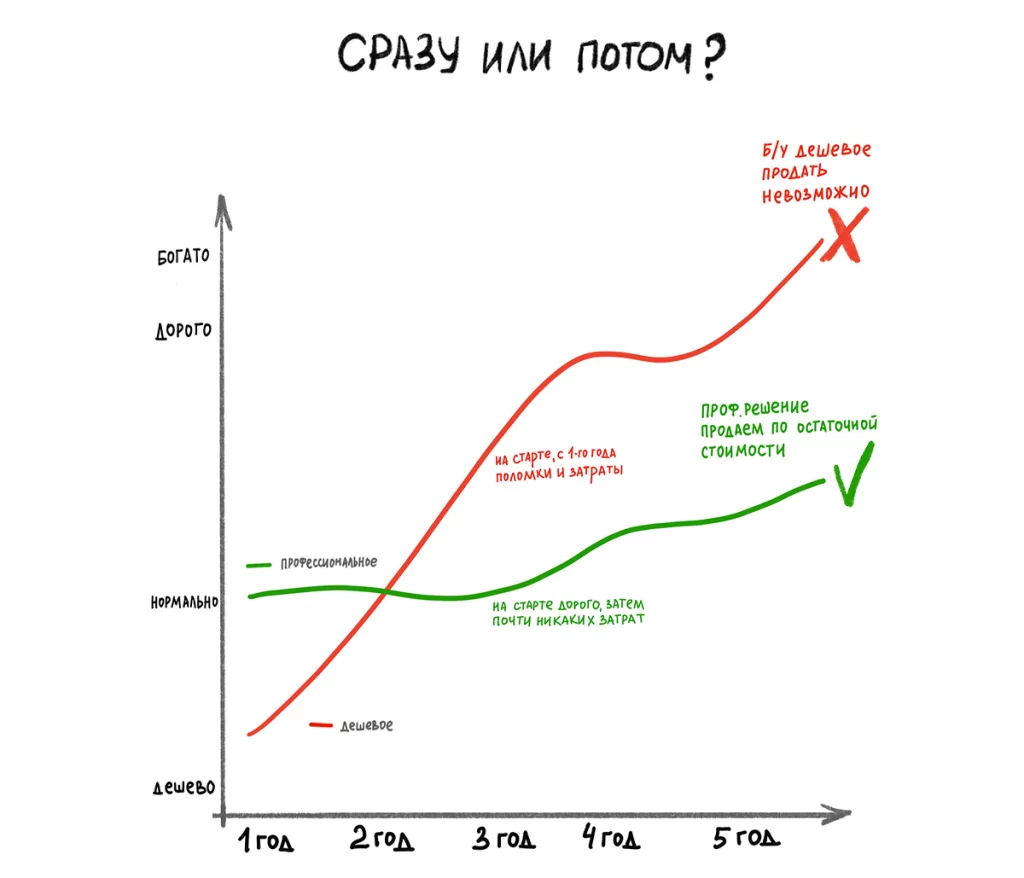 Интегратор Никита выбрал второй вариант. Он сделал самое дешевое предложение, но интегратор Олег сделал предложение еще дешевле, и забрал конкурс. Олег заработал на скидке 70% 7 тыс. рублей. В течение трех лет эксплуатации Олег потратил еще 40 тыс. на командировках для исправления багов стартапа.