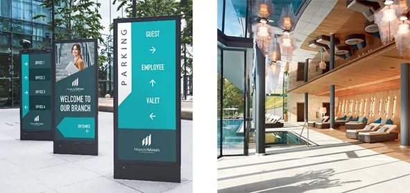 Рекламный контент может воспроизводиться на всепогодных дисплеях, расположенных перед входом в отель, а также на светодиодных поверхностях на фасадах здания. Эти решения могут быть использованы в парковых и пляжных зонах санаториев, загородных парк-отелей.