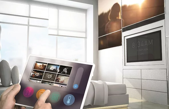 С помощью системы «умный дом» можно регулировать температуру воздуха в номере, включать и выключать освещение, управлять шторами. Однако, гости не всегда готовы устанавливать дополнительные приложения на свои гаджеты. Чаще для этих целей отели используют сенсорные поверхности или интеграцию с голосовыми помощниками. Управление через интерактивный планшет или дисплей более привычен и понятен. Вместе с тем их использование может быть сопряжено с задачей обеспечения сохранности. Набирающие популярность выдвижные мониторы Wize помогут в решении этой задачи. Планшеты или небольшие интерактивные дисплеи могут быть закреплены на стене или встроены в стол.