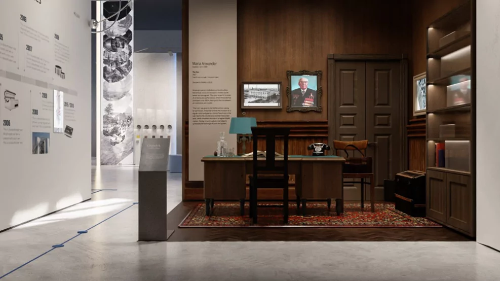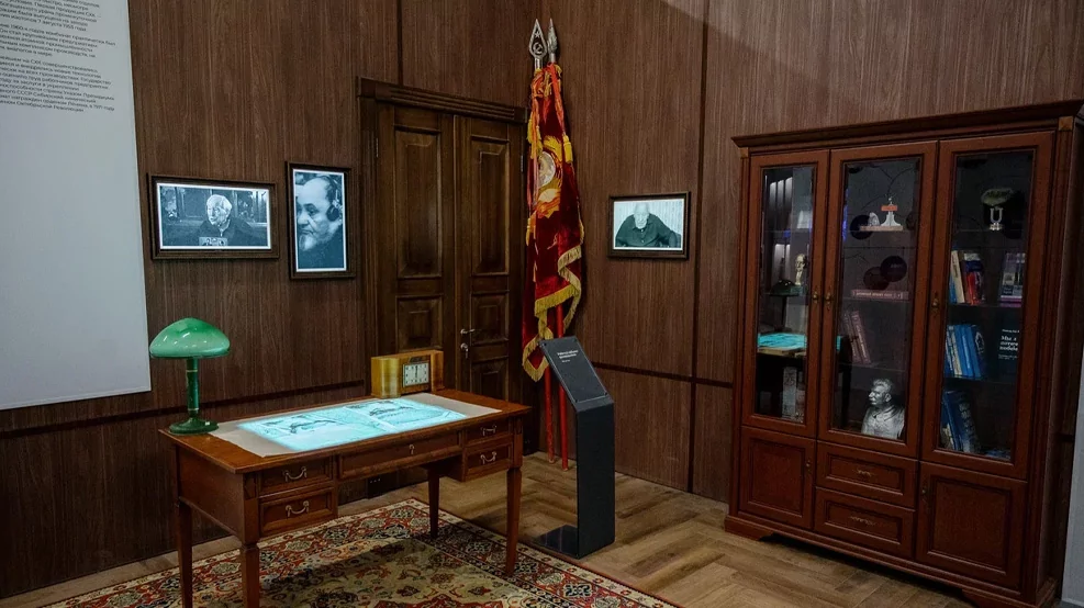 Рабочий кабинет спроектирован в стилистике мемориального пространства, что диктует минимально точечное использование современных медиа и витрин. Однако, именно к временам прошлого относятся большинство фотографических и видеоматериалов, а также инструменты, книги, награды. Предметы было решено разместить в шкафу со стеклянными дверцами, стилизованном под мебель середины прошлого века.