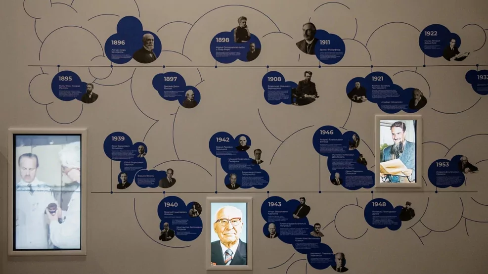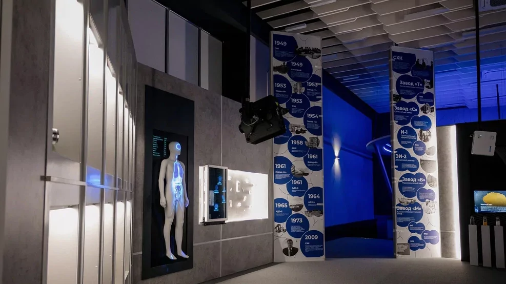 Ключевые вехи развития индустрии в СССР, например, первая в мире атомная электростанция в Обнинске, первый атомный ледокол «Ленин» − подчеркнуты медиаэкранами. Аналогично на схеме выдающихся физиков анимированы портреты Славского, Курчатова и других представителей советской научной школы. Контент на медиаэкранах (Open Frame дисплеи) − это изображения фотографий, хроника, обработанные и анимированные с помощью искусственного интеллекта, который «обучили» специалисты AUVIX. Черно-белый фотографии стали цветными.