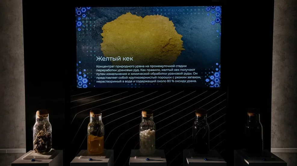 Контент о производстве ядерного топлива воспроизводится на 43”дисплее, перед которым находятся пять интерактивных подиумов с пробирками с муляжами веществ, из которых его производят. Контент, подготовленный специалистами AUVIX, рассказывает посетителям, что такое ТВЭЛ, как подготавливается ядерное топливо, как производятся оболочки ТВЭЛ и заполняются топливом. Если посетитель хочет узнать больше об урановой крупке, желтом кеке, он может нажать на кнопку перед колбой и на экране появится инфографика по выбранному веществу.