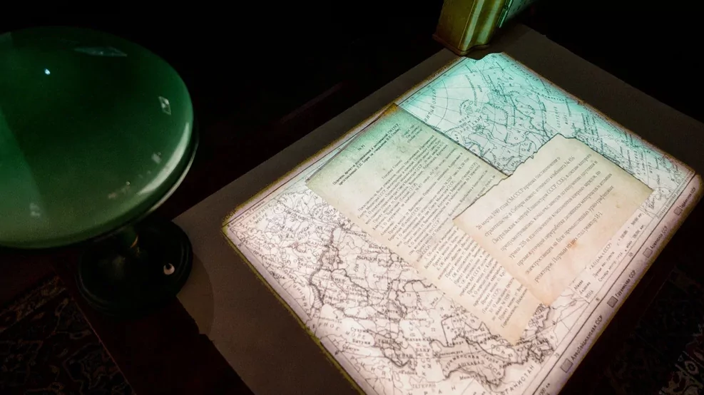 А фотографии в оцифрованном виде воспроизводятся на медиапанелях, обрамленных фоторамками. В видеоформате на письменном столе руководителя с помощью проектора воспроизводятся рабочие документы, распоряжения, газеты. Они «ложатся» поверх карты СССР, где пульсирующей красной точкой обозначен Томск-7, именно так город назывался в секретных документах. Лазерный проектор InFocus INL4128, размещенный вертикально над столом, светит на крафтовую бумагу. Благодаря этому приему не только создается имитация подлинности старых документов, но и отсутствуют блики, как это бывает, когда проекция осуществляется на белую поверхность.