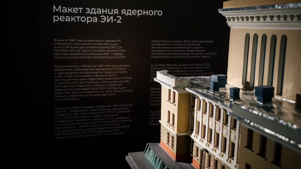 Макет проекта «Прорыв» логично перекликается с историческим экспонатом из первых экспозиций − макетом здания ядерного реактора ЭИ-2.