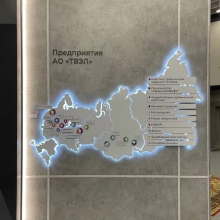 Включает предприятия по фабрикации ядерного топлива, конверсии и обогащению урана, производству газовых центрифуг, а также научно-исследовательские и конструкторские организации. Карта расположения этих объектов в России дополнена интерактивным 43” дисплеем, на котором можно узнать подробнее об их работе.