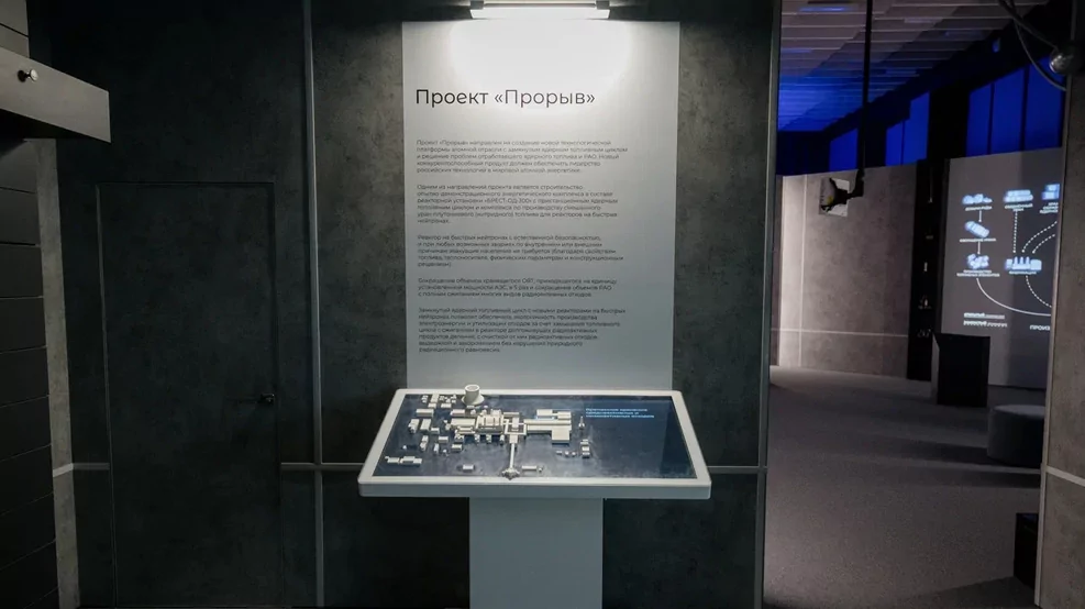 Проект «Прорыв» – это технологическая платформа атомной отрасли, не имеющая аналогов в мире, в рамках которой создается ядерная энергетика нового поколения на базе замкнутого ядерного топливного цикла с использованием реакторов на быстрых нейтронах. О нем рассказывает макет предприятия с новыми реакторами на быстрых нейтронах. Он закреплен на поверхности панели, на которой возникают цифровые описания о соответствующих блоках предприятия и этапах работы.