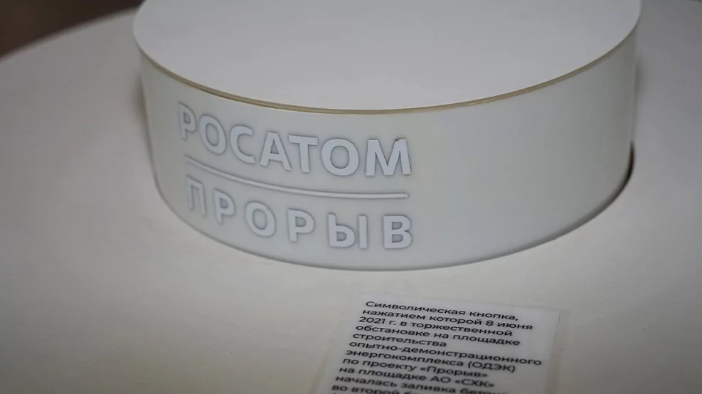 Посетители с большим удовольствием фотографируются с символической кнопкой «ПРОРЫВ», нажатием которой 8 июня 2021 года на площадке строительства опытно-демонстрационного энергокомплекса (ОДЭК) по проекту «Прорыв» . началась заливка бетона во второй блок здания реактора.