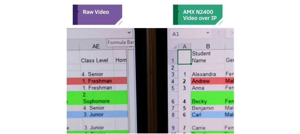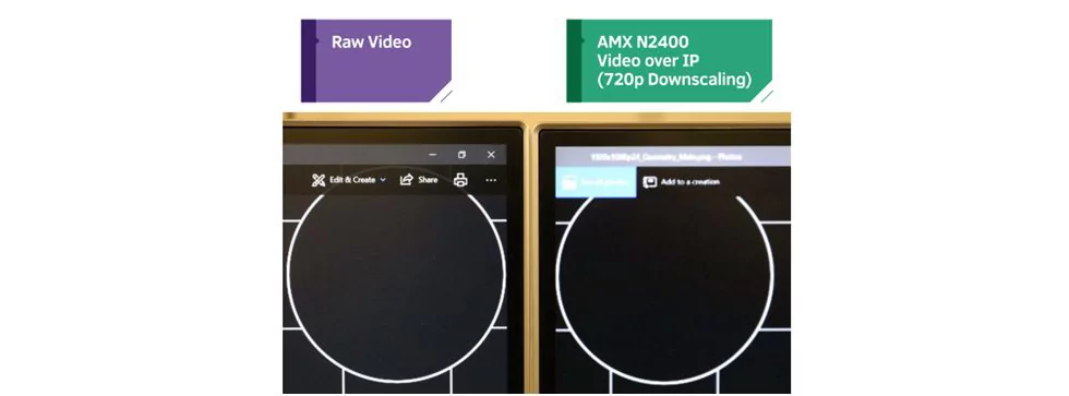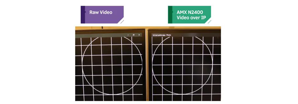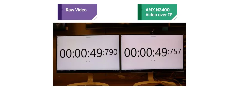 Решения для передачи видео по IP-сетям, предназначенные для работы в помещении, например AMX серии N2400 (арт. 117870, 116264) , могут распределять 4K60 видео 4:4:4 с задержкой менее двух кадров в секунду. На изображении выше вы можете видеть это, сдекодированное изображение (справа) с 33мс отстает от оригинального видео (слева). Поскольку задержка практически незаметна, любые различия в задержке между различными приборами настолько незначительны, что это несущественно для любого реального приложения. Фактически, задержка в видео по IP настолько низка, что такие производители, как HARMAN, фактически ввели возможность вручную добавить задержку обратно в систему. Сетевые AV-продукты AMX часто используются в проектах для диспетчерских и конференц-залов, поэтому добавление нескольких кадров задержки в систему гарантирует синхронизацию всех декодеров подключенных к видеостене. Тем не менее, существуют приборы, которые дают значительную задержку, но они предназначены для работы в открытых сетях с низкой пропускной способностью. Например, декодеры H.264 (как серии AMX N3000 арт.119930, 119931), которые популярны, потому что формат кодирования H.264 имеет очень низкую пропускную способность и позволяет организовать трансляцию через интернет.