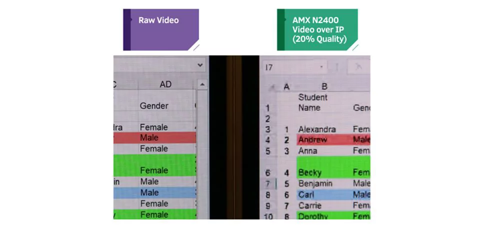 Хотя черные линии по-прежнему остаются такими же темными, как и на исходном изображении, текст размыт, а линии не такие четкие. Это происходит потому, что изображение масштабируется до разрешения 720p от исходного 4K60 4:4:4. Поскольку масштабирование производится на декодере (после декодирования), это не снижает нагрузку на сеть. Однако масштабирование до кодирования может быть необходимо, если разрешение исходного сигнала выше, чем разрешение дисплея. Изображение хуже, и целесообразно использовать более низкое разрешение источника, а не масштабировать изображение. Это, скорее всего, не будет заметно на динамичном видео, но для электронных таблиц это не лучший вариант. Важно отметить, что ни один из этих параметров не являются "плохим". Некоторые параметры - это результат ошибки в настройке приложения. Конфигурирование кодеров всегда требуют компромиссов между желаемым качеством видео и доступной пропускной способностью сети, используемых программ и исходного качества контента. Вот почему важно иметь широкий диапазон настроек на приборах AV over IP.