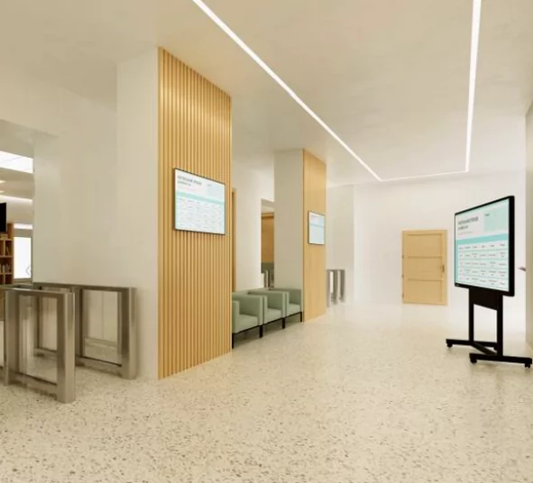 В библиотеке или читальном зале с помощью интерактивных дисплеев нужно организовать доступ учащихся и преподавателей к информационно-справочной системе библиотеки. Система бронирования поможет в работе библиотекаря. А выдвижное мониторы WIZE обеспечат доступ к электронным ресурсам библиотеки в читальном зале.