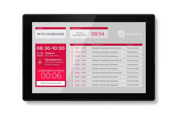 • электронного бронирования аудиторий и отображение расписания помещения на мониторе у входа в класс;