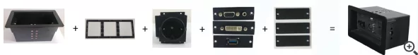 Каждый лючок состоит из металлического корпуса, монтажной рамки, заглушки и модулей-переходников. Всего доступны 9 слотов, 3 из которых занимает модуль-розетка на 220 В, а 6 оставшихся выделены для установки модулей-переходников. Если они занимают не все свободные места, то незадействованные слоты можно заменить заглушками.