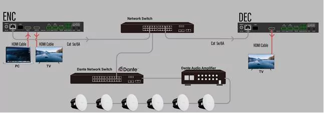 Новые приборы iSwitch 2000D оснащены встроенным 2-канальным аудиопередатчиком. Звук из HDMI или балансного аналогового аудиовхода может быть передан по сети на совместимое аудиооборудование с использованием протокола Dante без задержек и потерь. Это позволяет передавать звук с HDMI или аналогового аудиовхода на усилители, DSP или микшеры с поддержкой Dante.