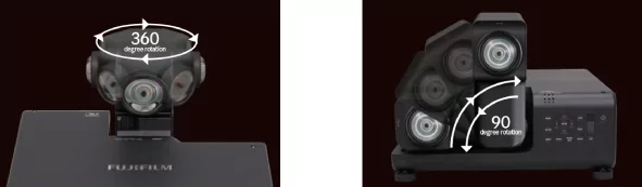 Основная особенность объектива заключается в том, что он имеет двухосевую поворотную конструкцию. В отличие от традиционных проекторов, где объектив жестко установлен внутри устройства, в модели FUJIFILM FP-Z8000 положение объектива можно отрегулировать. Он может «смотреть» в любое желаемое направление и проектировать изображения на стену, потолок пол в зависимости от ситуации и расположения. Кроме того, он также позволяет легко переключаться между вертикальным и горизонтальным отображением.