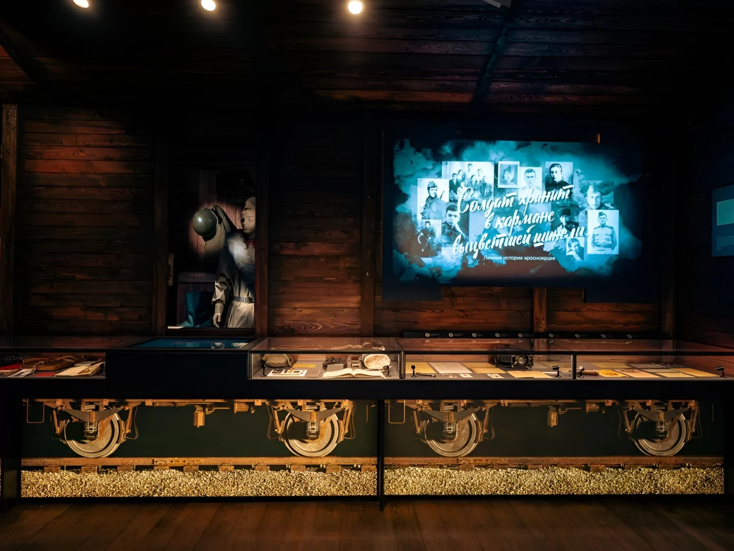 В зале «Железнодорожный вагон» ритмичный стук вагонных колес сопровождает экспозицию, посвященную отправке солдат на войну. Этот фоновый звук напоминает о долгих и тяжелых переездах, которые стали для многих бойцов началом трудного пути.
