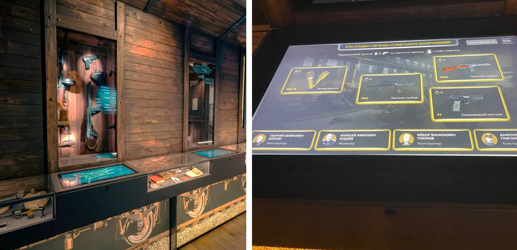 Большой информационный пласт собран в мультимедийных приложениях, которые дополняют музейные экспонаты. В вертикальных витринах выставлены солдатские каски и образцы оружия, а на встраиваемых сенсорных экранах LUMIEN у их основания посетители могут выбрать любой предмет и погрузиться в его историю, изучив детальное описание. Особый интерес экспозиция вызывает у подростков: в интерактивном формате они знакомятся с легендами советского вооружения и гениальными конструкторами, стоявшими за их созданием.