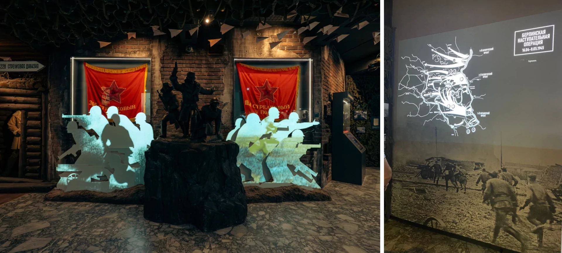 В разделе про участие сибиряков в битве за Москву проекция хроники осуществляется на белые декоративные фигуры бойцов, идущих в атаку. Берлинская наступательная операция представлена динамической проекцией карты боевых действий на стену с фотографией. Такие приемы добавляют экспозиции художественной выразительности и сохраняют единство экспозиционного пространства.