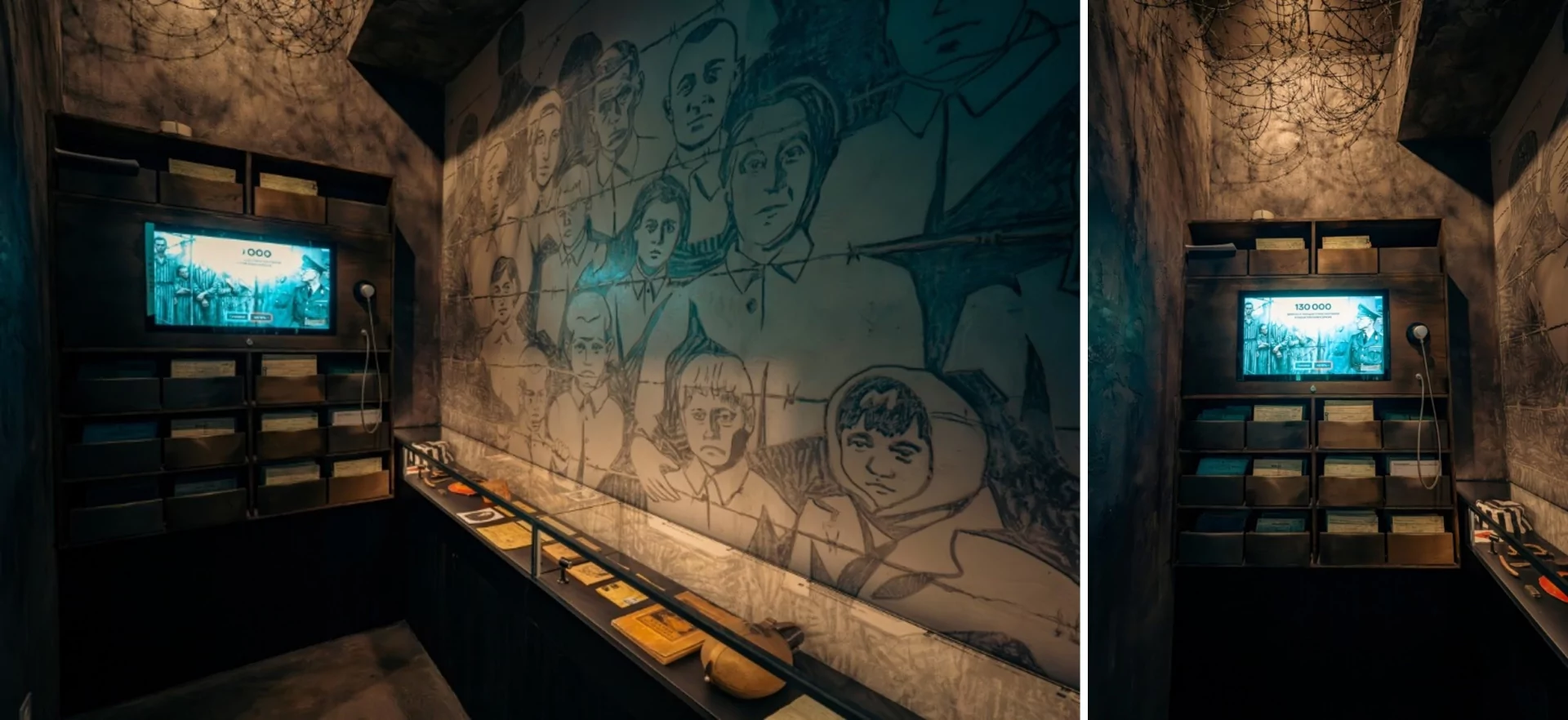Небольшой, но очень эмоциональный раздел, посвящен узникам концлагерей. Здесь посетители знакомятся с примерами картотек узников немецких и финских лагерей, с цифровым приложением на встроенном дисплее. А на противоположной стене воспроизводятся фрагменты фильма «У них есть Родина» 1949 года, о советских детях, которых оккупанты увезли за границу в годы войны, а также видеорассказы выросших детей-узников концлагерей.