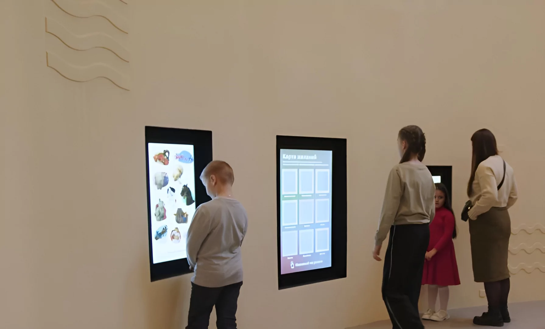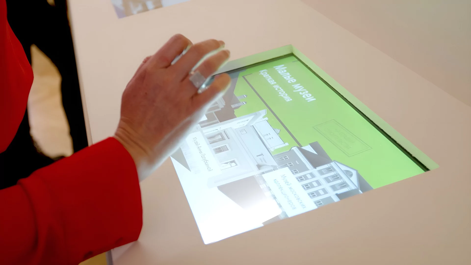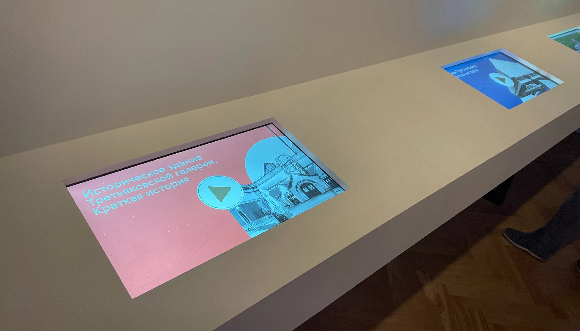 Про историю филиалов Третьяковки рассказывают мультимедийные приложения, работающие на встраиваемых интерактивных дисплеях Lumien. Посетители самостоятельно запускают интересующие их видео ролики.