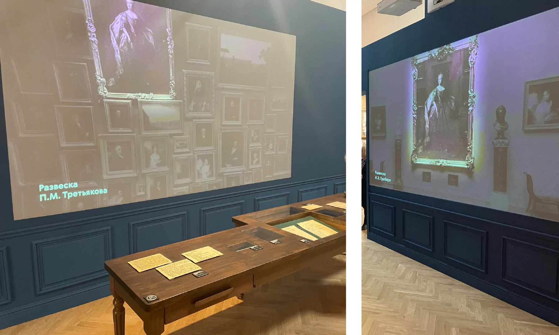 С помощью этих проекторов посетители могут сравнить развеску картин в Галерее при П.М. Третьякове и И.Э. Грабаре. Две инсталляции расположены на противоположных стенах.
