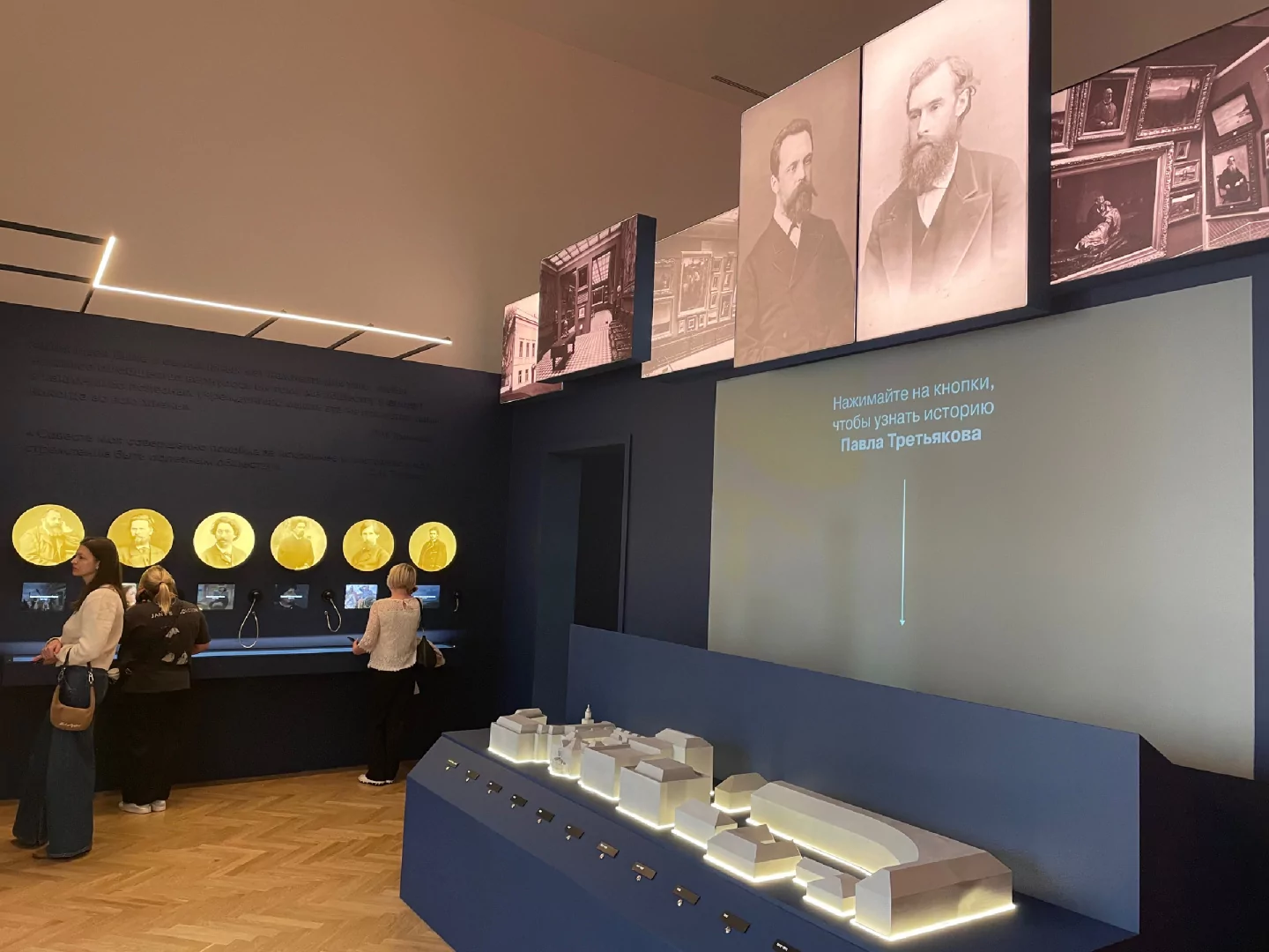 Зал истории отрывается инсталляцией, где посетители могут, нажимая кнопки, увидеть основные события из жизни братьев Третьяковых и Галереи.