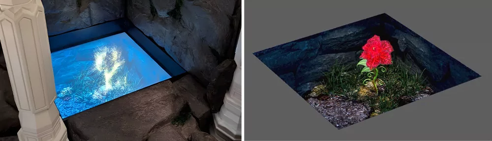 Кульминацией всей экспозиции, как и самой сказки, становится появление Аленького цветочка. Он «расцветает» на квадратном дисплее Lumien LSQ3301FHD. Дизайнеры Kochubey Media создали уникальную анимацию, добившись максимального эффекта глубины и объема. Цифровое чудо дополнено виртуальными элементами декора, перекликающимися с реальным оформлением комнаты, что создает иллюзию «колодца» или портала в сказку.