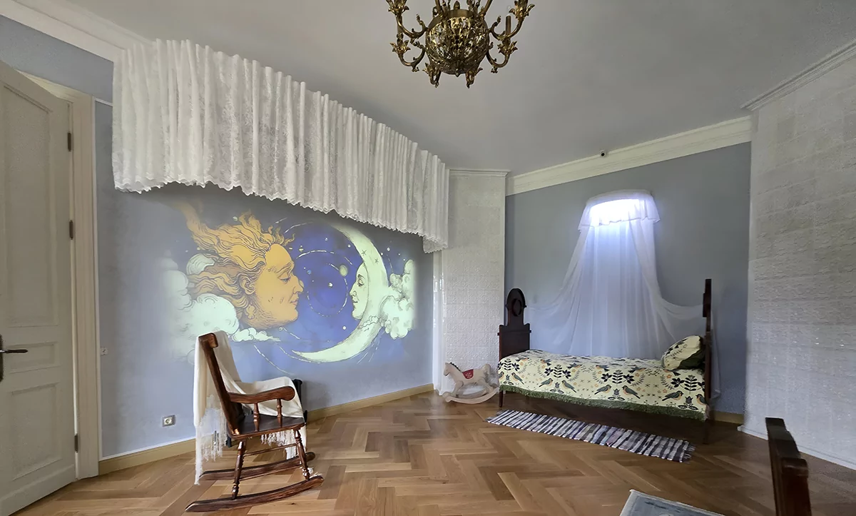 Для придания визуальному ряду характерной для снов размытости и плавности переходов к работе были привлечены нейросети. Запускается это волшебство просто: экскурсовод нажимает на скрытую кнопку, над кроваткой загорается свет, переливаясь разными оттенками, а на стене начинается видеопроекция.