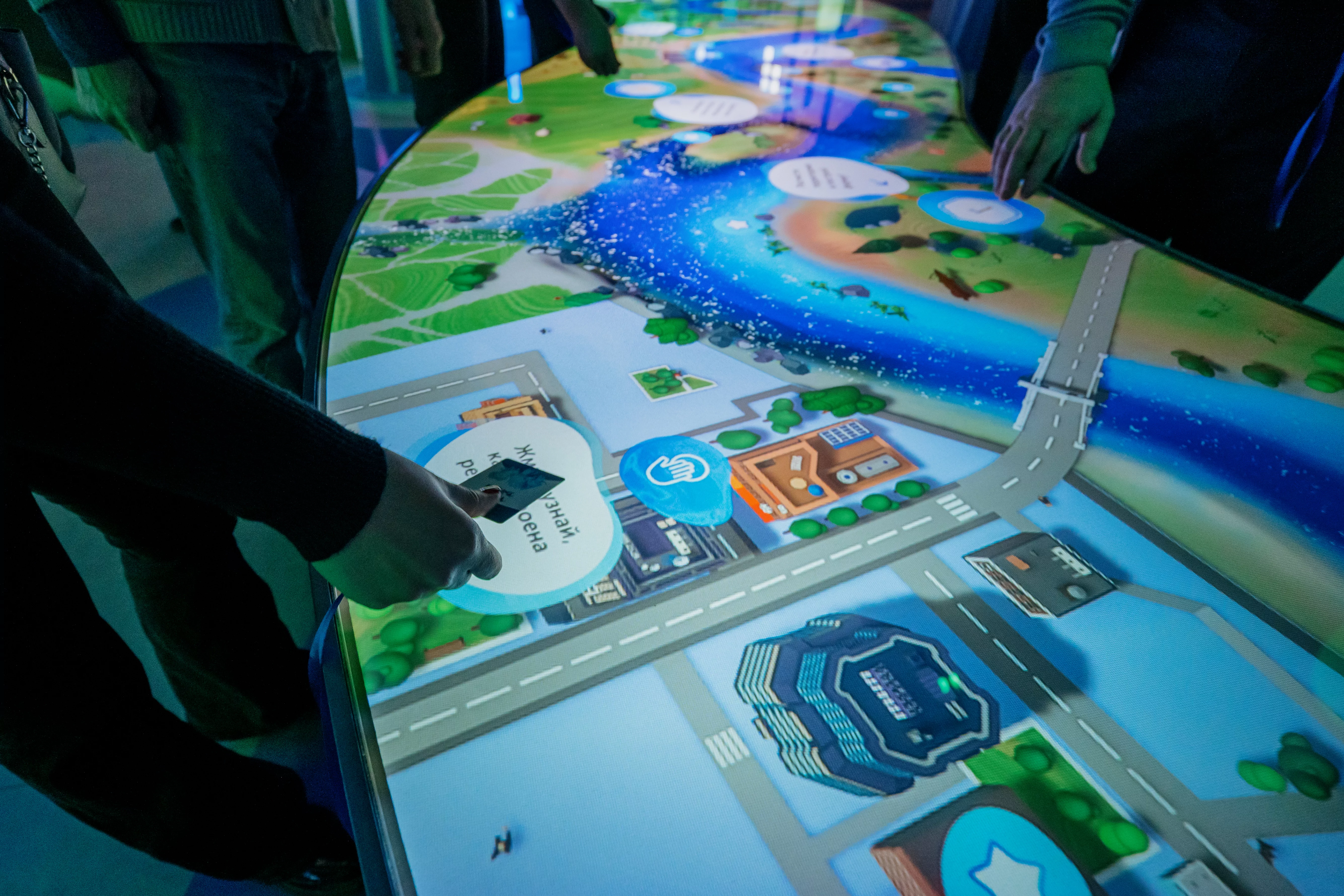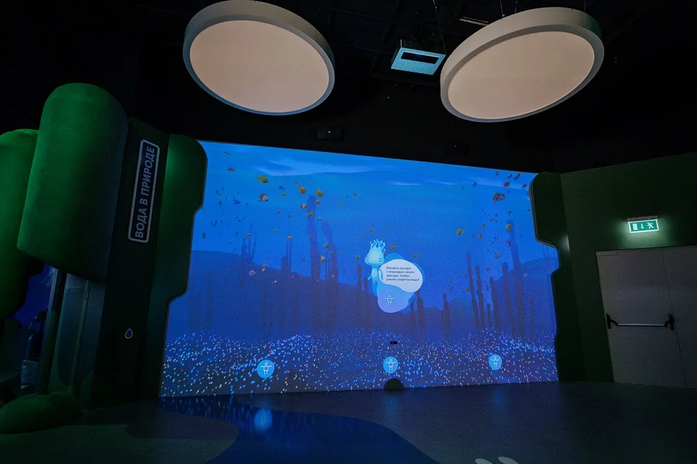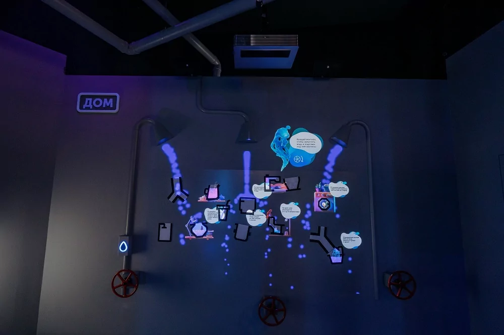 Получить первую капельку можно, узнав ответы на вопросы о происхождении воды и приложив карточку-метку к цифровой капельке-считывателю. Вопросы появляются в пузырьках на проекционной стене.