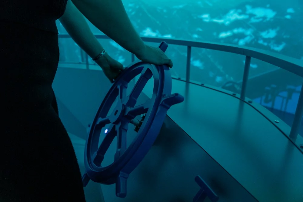 Чтобы добраться до Арктики посетителям предлагается взойти на капитанский мостик и совершить виртуальное путешествие по просторам трех океанов. Вращением штурвала судно приходит в движение, палуба качается, создается шумовое оформление и открываются бескрайние просторы океана.