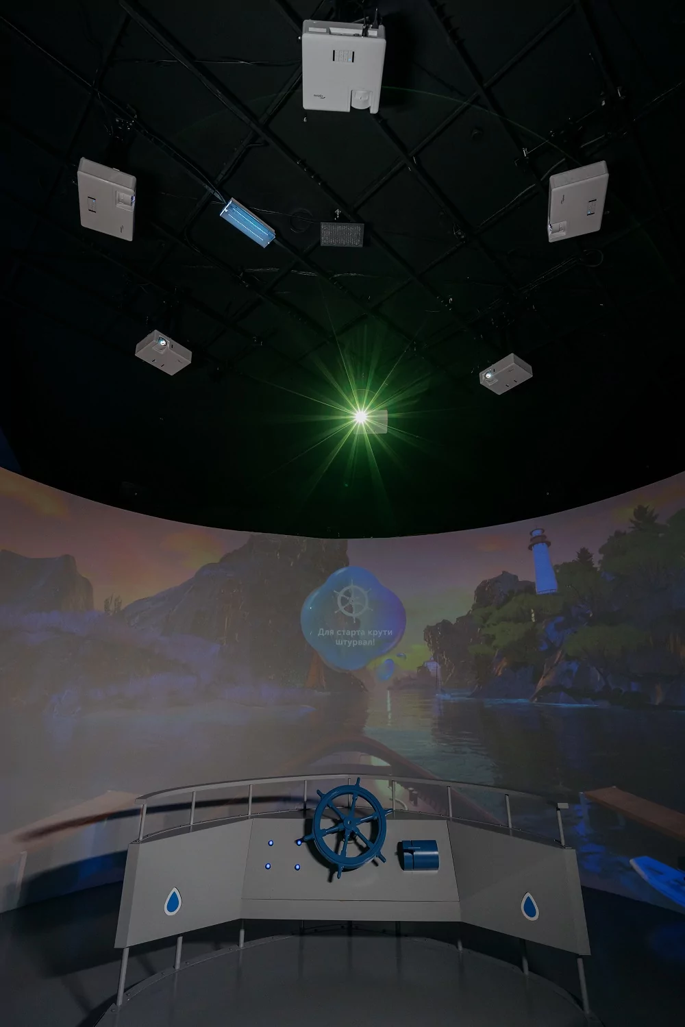 Для визуализации мира океана используется панорамная проекция 360° с помощью бесшовной сшивки изображений 6 проекторов Optoma, обеспечивающих равномерное покрытие всей площади проекции. Звуковые эффекты создаются сабвуфером, а для ощущения качки на капитанском мостике – подпружиненная платформа из 16 пружин.