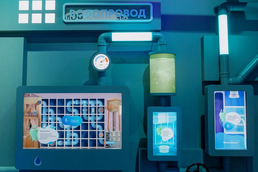 На площади 410 квадратных метров разместилось свыше  20 интерактивных инсталляций, которые в игровой форме демонстрируют долгий путь воды к потребителю и напоминают о ее значимости для всего живого на Земле.