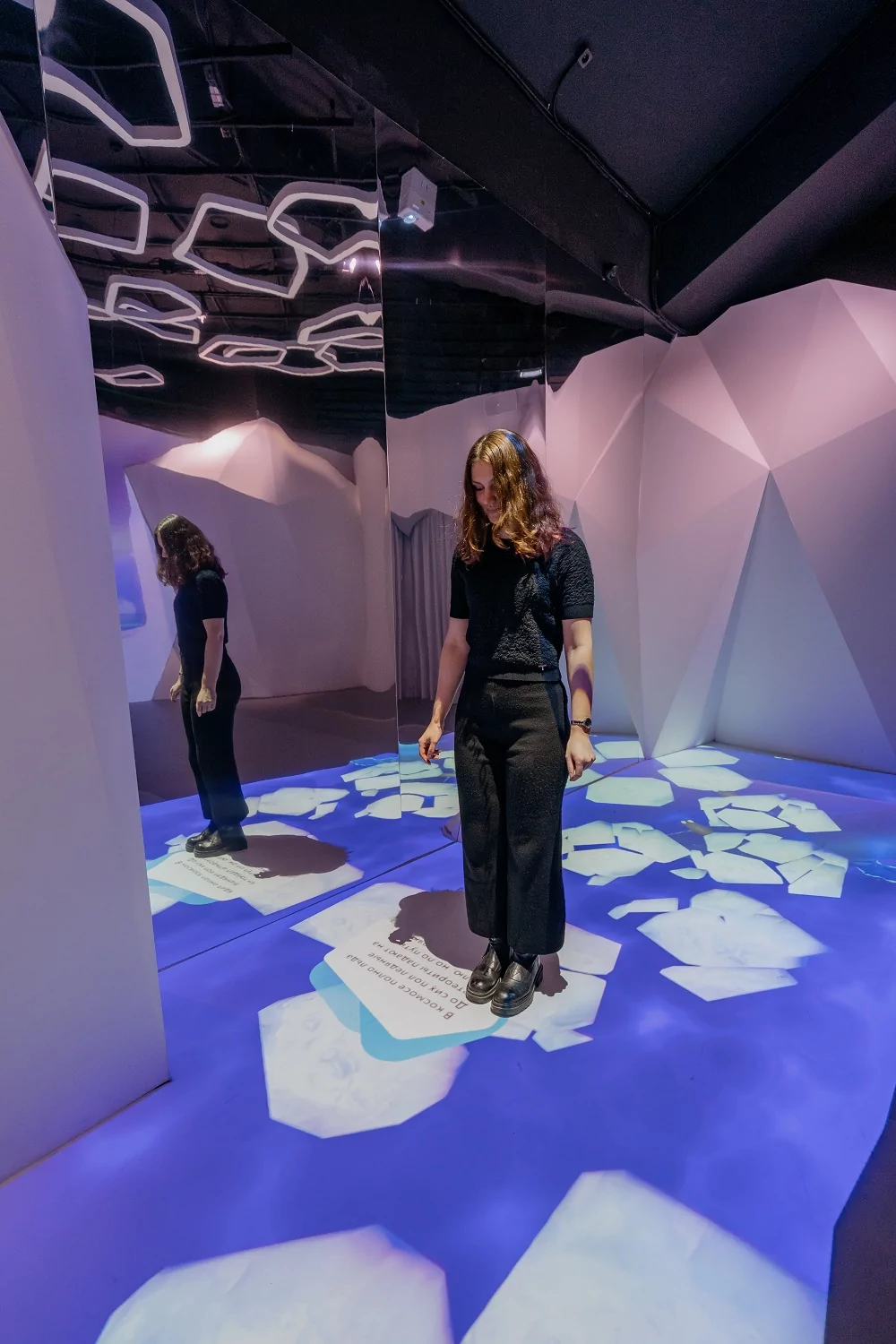 Когда посетитель попадает в зону этой инсталляции, на полу начинается движение льдинок. При ударе ногой по такой льдинке она разламывается, и появляется информация о природе льда.