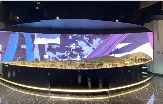 Интересный прием использован для оживления макета с конным обозом – проекция на нарисованную реку видео текущей воды, что придает динамику статическому сюжету.