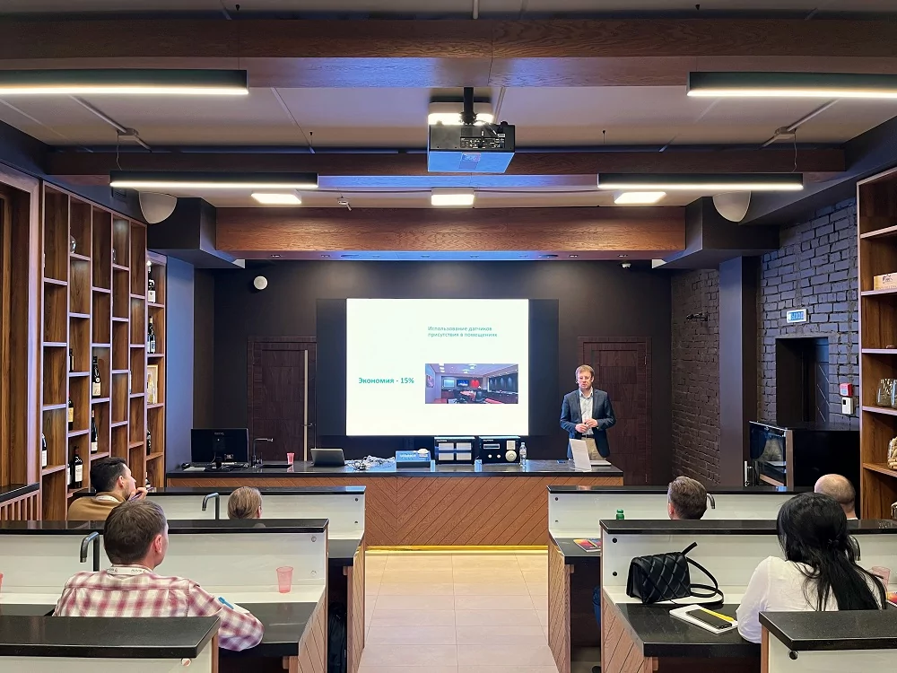 Основной фокус семинара был направлен на системы управления освещения при помощи удобных для пользователя алгоритмов, применение альтернативных сценариев и отход от классической «электрики». Был сделан акцент на том, что для достижения максимального удобства пользователя при проектировании систем управления следует отказаться от многообразия выключателей и стремиться применять пульты с минимальным количеством кнопок. Были подробно рассмотрены протоколы управления освещением DALI, DALI-2 и DMX, их особенности и преимущества, а также даны рекомендации по выбору.
