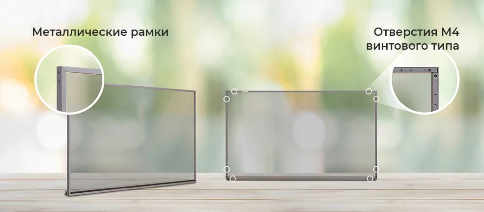 Надежная конструкция дисплея обеспечивает прочность изделия и удобство при монтаже. Металлическая окантовка повышает жесткость изделия, а отверстия M4 винтового типа по углам облегчают инсталляцию.