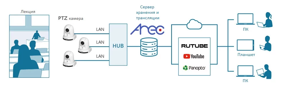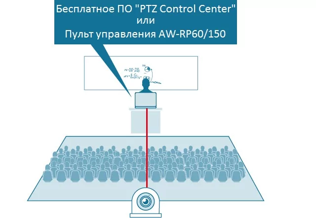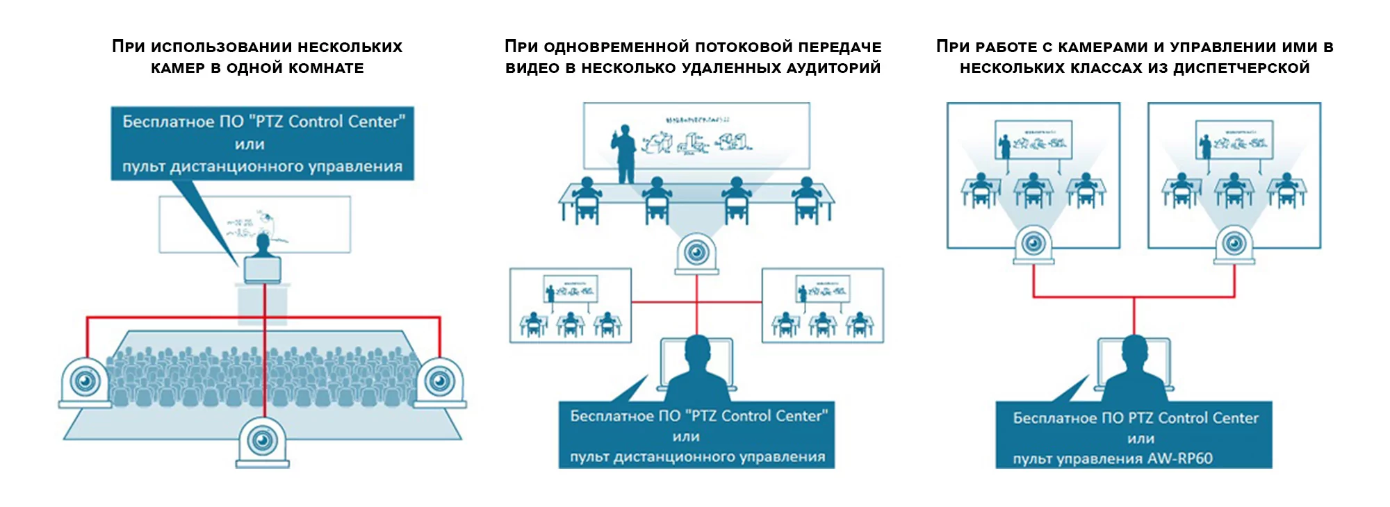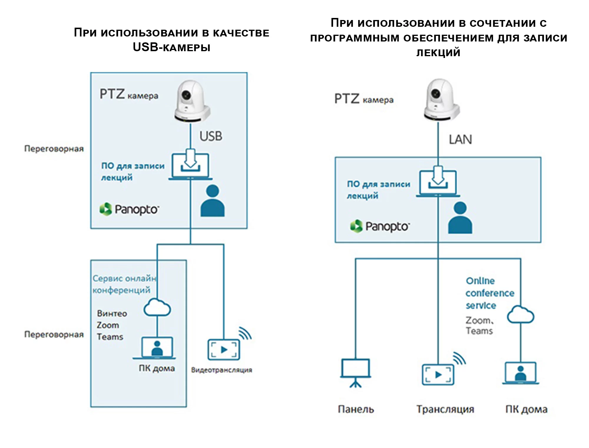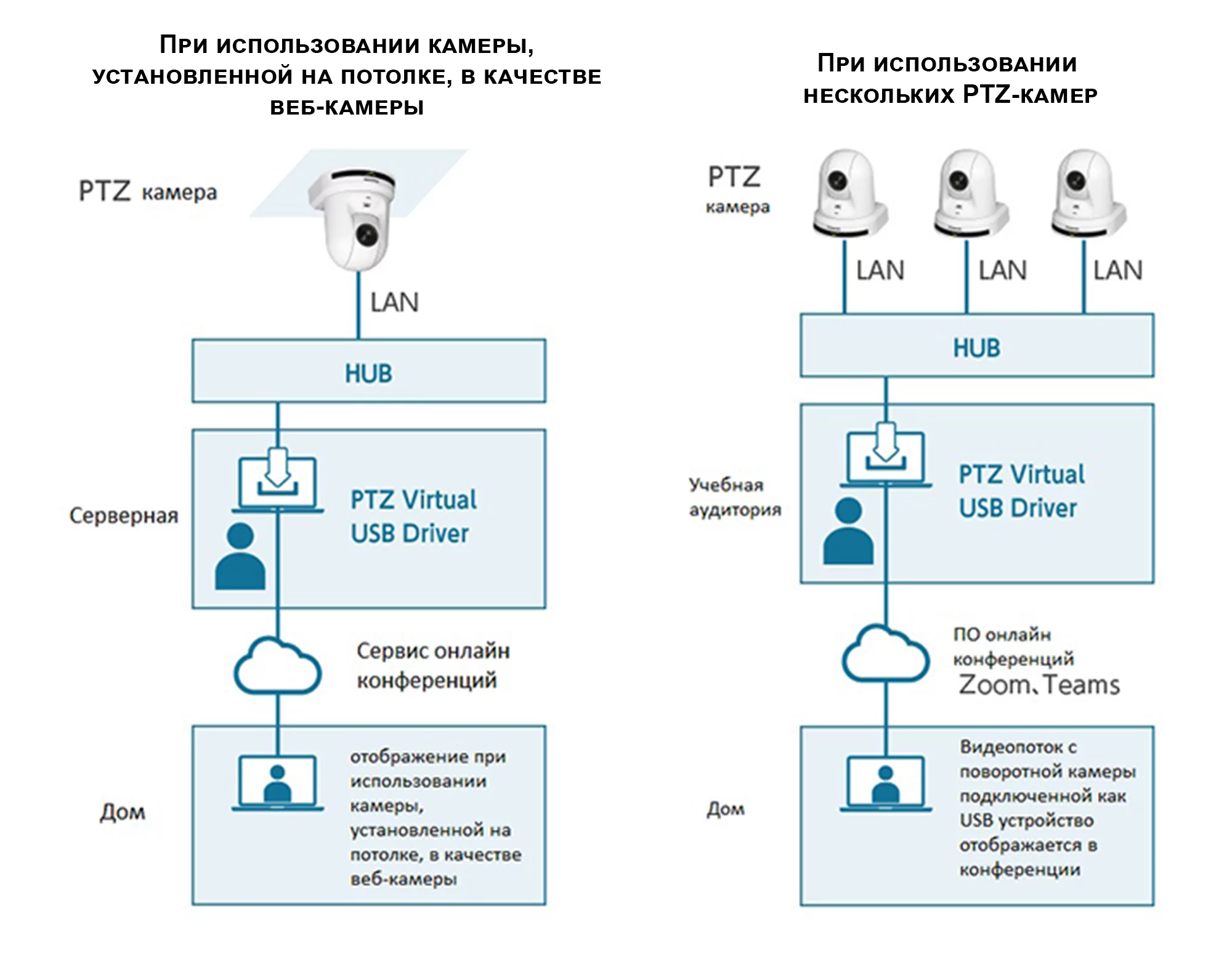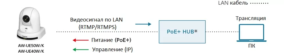 AW-UE50 /UE40 поддерживают UVC, поэтому их можно использовать с существующей системой на базе USB. Один сетевой кабель можно использовать для подключения нескольких камер к ПК, что позволяет экономить время при установке и настройке простой и компактной системы. С помощью бесплатного программного обеспечения PTZ Virtual USB Driver AW-UE50/UE40 можно использовать в качестве веб-камер, подключаемой к онлайн-конференции по кабелю локальной сети, даже если USB-кабель не может дотянуться до места установки камеры, например, до потолка.