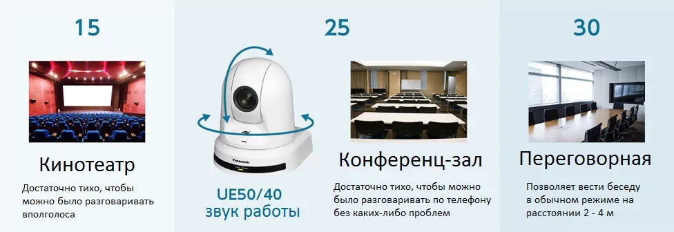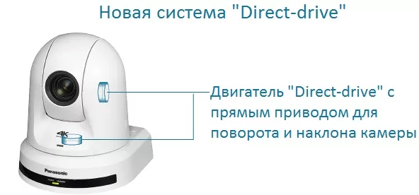 Поскольку камеры AW-UE50/UE40 работают очень тихо, их можно использовать на собрании, проводимом в конференц-зале, когда тишина является необходимым условием, или на занятиях, проводимых в просторном лекционном зале, не беспокоясь о звуке от работы камеры. Новый двигатель с прямым приводом работает бесшумно при панорамировании (горизонтальное перемещение) и наклоне (вертикальное перемещение), поэтому работа камеры не мешает проведению важных встреч и лекций.