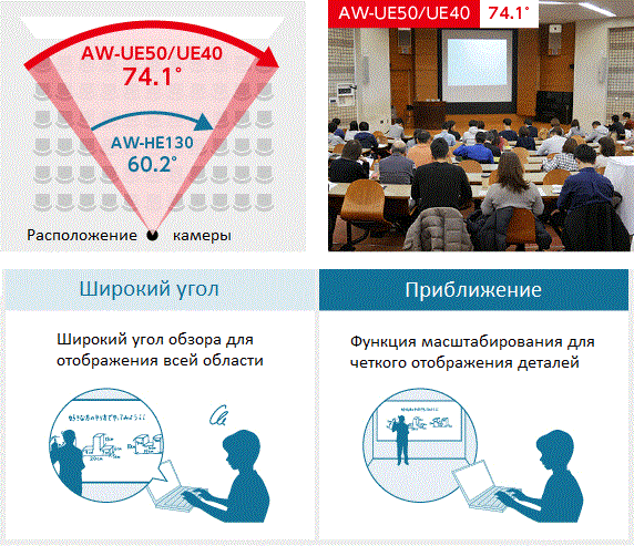 Высококачественные изображения, снятые широкоугольной камерой 4K, четко показывают интерьер классных комнат и холлов, а также выражения лиц преподавателей и выступающих на кафедрах, таким образом передавая обстановку и «атмосферность» с помощью потокового видео. Кроме того, функция масштабирования позволяет четко выделить важные моменты на слайде или доске для удобного восприятия на уроках в классе или бизнес-презентациях. Используя широкий угол обзора до 74,1 ° и функцию масштабирования, можно избежать пропуск важных сцен при обучении в классе или на деловой встрече с небольшим количеством камер. AW-UE50/UE40 могут использоваться для широкого спектра применений независимо от размера помещения.