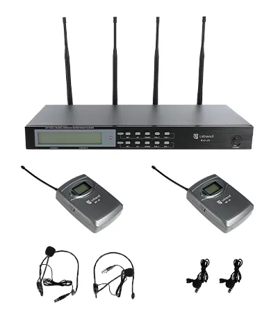 Модель ITWMIC-JS-LH объединяет два поясных передатчика на батарейках АА, два головных микрофона и два петличных микрофона.