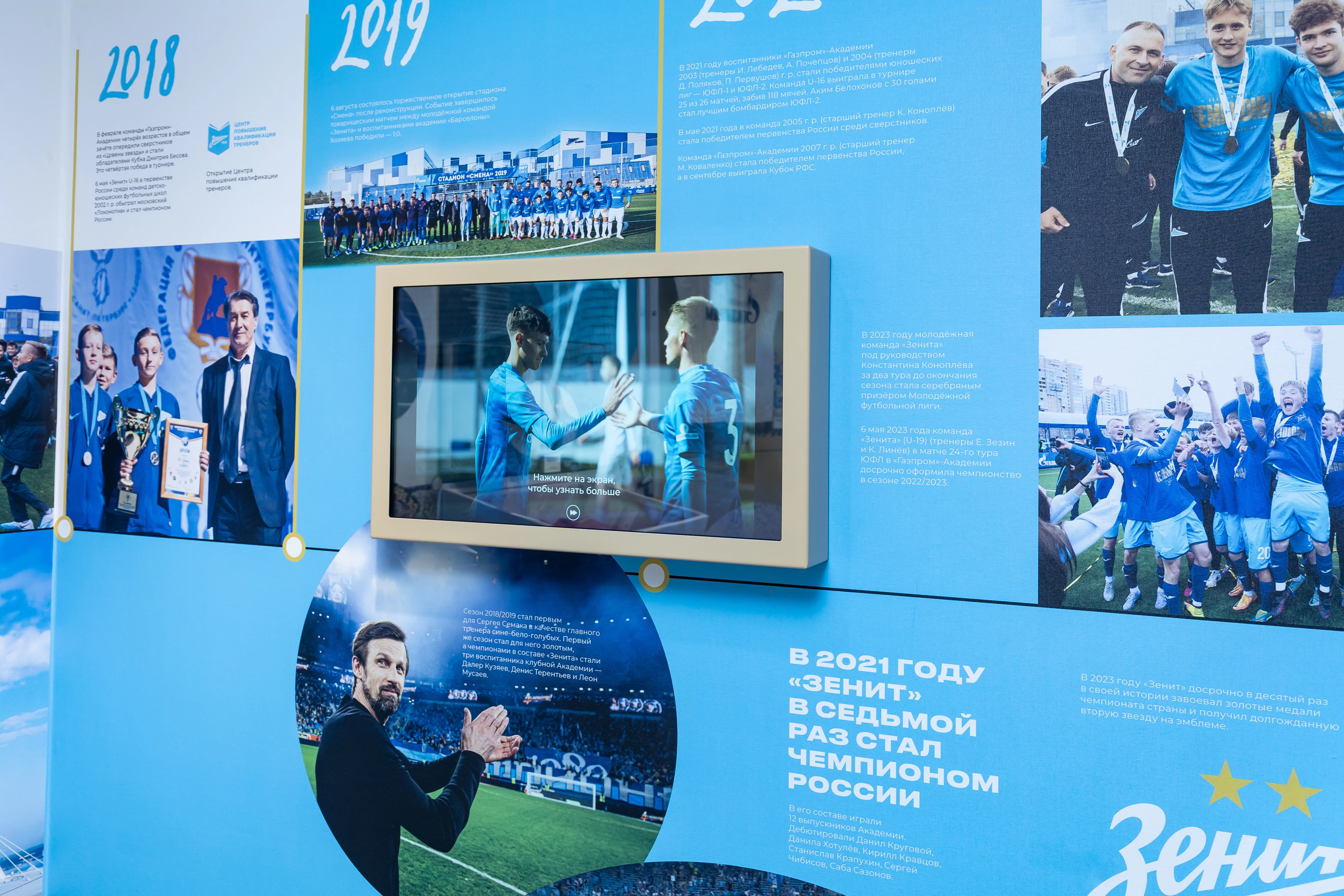 На первом этаже главного здания школы был создан музей истории «Газпром»-Академии ФК «Зенит» и футбольной школы «Смена». Проект был реализован известным петербургским бюро музейной сценографии «Метаформа». Для оснащения музейного пространства было использовано 8 встраиваемых дисплеев с проекционно-емкостным сенсорным экраном LUMIEN LFT2701PC.