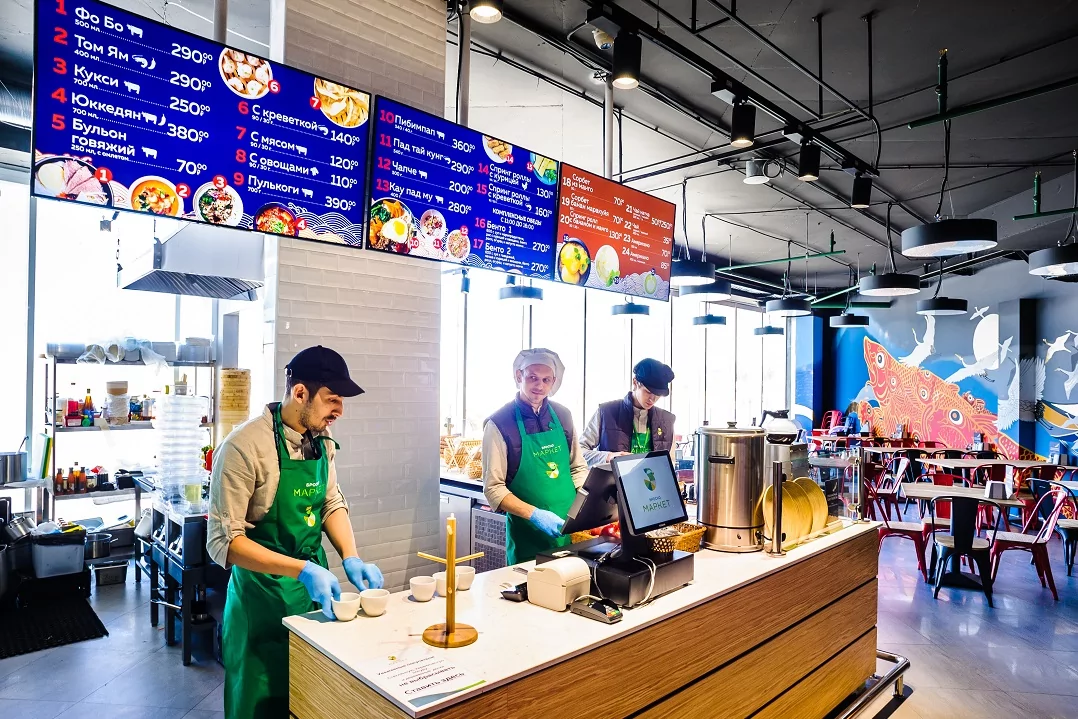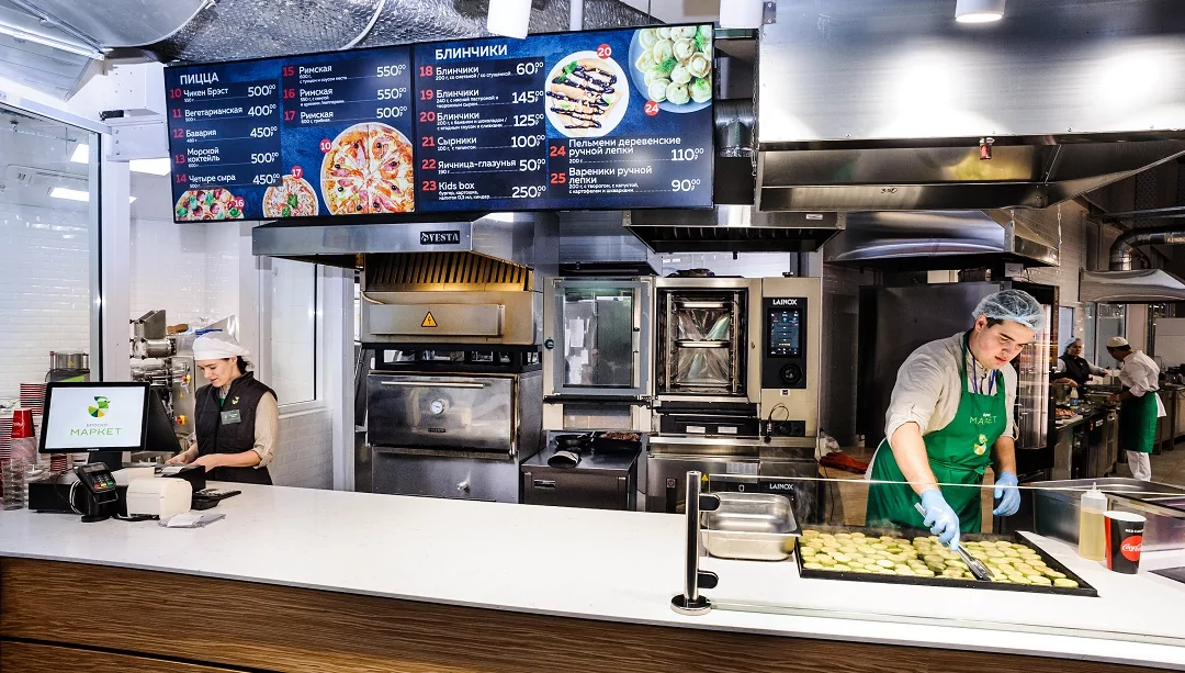 В зоне фуд-корта установлены менюборды – профессиональные панели Samsung с программным обеспечением SmartPlayer, отображающие меню и информирующие покупателей о ценах, акциях и специальных предложениях.